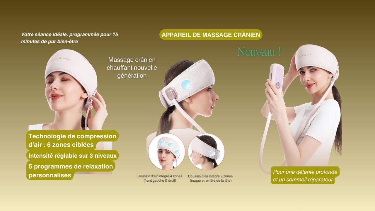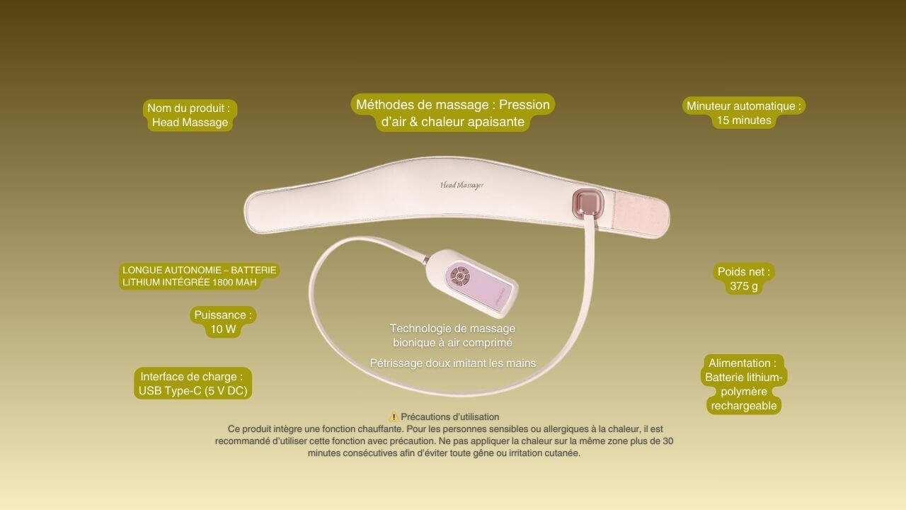 Massage complet 6 zones : coussins d’air intégrés pour le front, les tempes et la nuque, imitant les mouvements d’un vrai massage aux doigts.