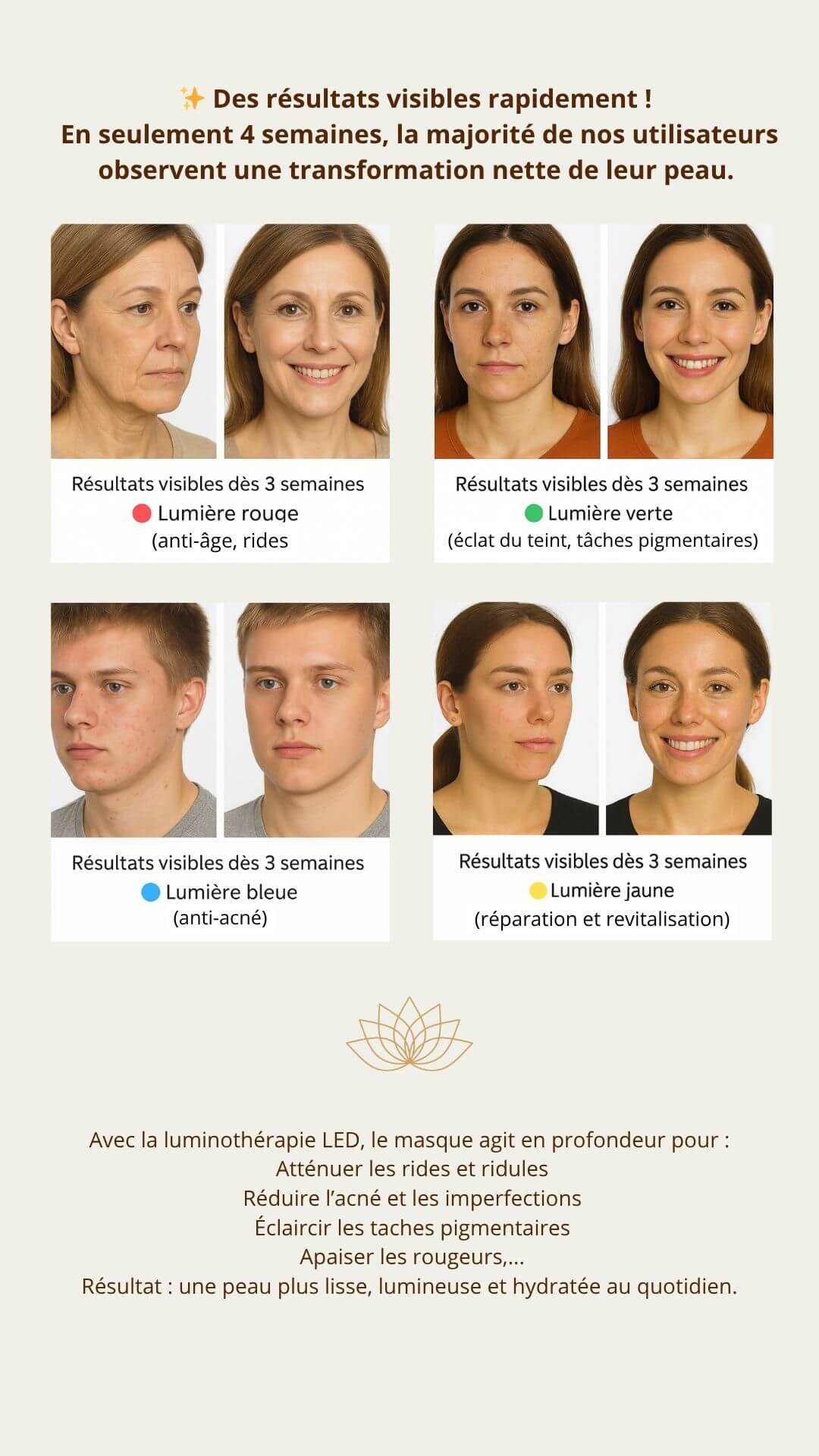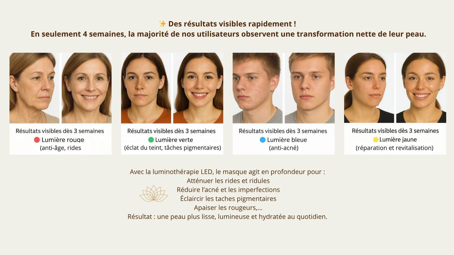Oui ✅ De nombreuses études scientifiques confirment l’efficacité de la luminothérapie LED sur la régénération cutanée. Nos clients constatent généralement une peau plus lumineuse et plus ferme dès les premières semaines d’utilisation régulière.